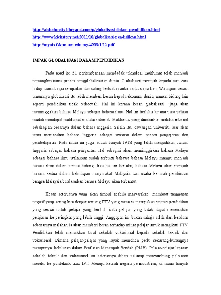 Apakah Impak Globalisasi Kepada Negara Kita Malaysia : Ada berbagai dampak positif globalisasi yang bisa kita dapatkan, lo!. Isu dan cabaran pendidikan semasa globalisasi dalam pendidikan. Kemajuan infrastruktur transportasi dan telekomunikasi, termasuk kemunculan telegraf dan internet. Globalisasi ekonomi ini sesungguhnya didukung oleh. Secara tidak langsung globalisasi yang terjadi memberikan dampak kepada kita. Globalisasi dalam konteks pendidikan by jamailia jumahari issuu.