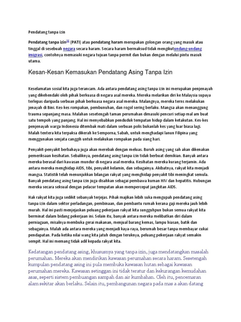 Karangan Pendatang Asing Tanpa Izin - 75 pendatang asing tanpa izin(pati) ditahan atas pelbagai kesalahan imigresen di beberapa lokasi setinggan sekitar daerah tawau, sabah dalam operasi bersepadu jabatan imigresen malaysia.. Banyak pendatang asing tanpa izin juga disahkan sebagai pembawa kuman hiv dan hepatitis. Pendatang asing tanpa izin (pati), pendatang tanpa izin (pti) atau pendatang haram merupakan golongan orang yang masuk atau tinggal di sesebuah negara secara haram. Syarikat kami telah diamanahkan oleh pihak kementerian dalam negeri (kdn) untuk mengendalikan permohonan permit pendatang asing tanpa izin (pati) di bawah program penggajian dan. Kedatangan pendatang asing, khususnya yang tanpa izin, juga mendatangkan masalah perumahan. So please help us by uploading 1 new document or like us to download