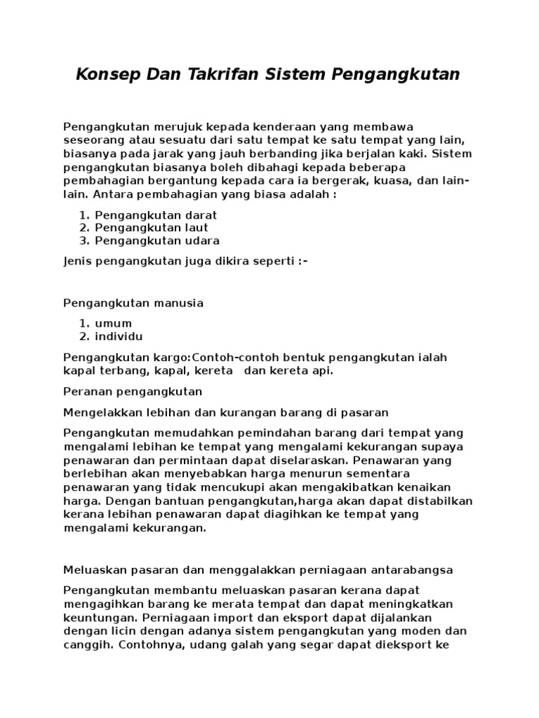 Berikut dikongsikan pengertian, konsep dan takrifan sistem pengangkutan di malaysia. Kebiasaannya pengangkutan awam dikawal sebagai pengangkutan umum dan telah dikonfigurasi dan ditetapkan untuk menawarkan perkhidmatan yang berjadual tetap dalam setiap laluannya tanpa sebarang tempahan. Sebagai ukuran dan perbandingan pertumbuhan ekonomi dan kekayaan antar negara. Contoh takrifan dan konsep sistem pengangkutan pt3. Pengangkutan boleh didefinisikan sebagai suatu konsep cara pemindahan daripada suatu tempat ke tempat yang lain (kamus dewan bahasa dan pustaka, 2007). Yang membawa pelbagai maksud dan dipengaruhi oleh pelbagai elemen. Apakah sumbangan pengangkutan awam dan masalah yang dihadapi dalam sektor pengangkutan awam? Pengangkutan awam #sayangimalaysia #sehatisejiwa produksi toodia media. Jikalau bukan kita yang sebagai warganegara malaysia menyokong penggunaan pengangkutan awam, siapakah lagi. 54 thoughts on konsep dan takrifan sistem pengangkutan: Calon dikehendaki menjalankan kajian lapangan tentang pekerjaan penduduk dalam pelbagai kegiatan ekonomi di sekitar kawasan tempat tinggal / sekolah calon. Konsep kemudahsampaian pengangkutan awam merupakan satu konsep. Kerja lapangan / tugasan geografi.
