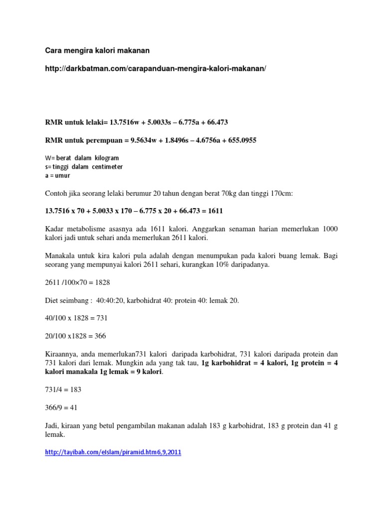 Maksudnya, semua jenis makanan dan minuman hendaklah dikira dalam jumlah tertentu bergantung kepada berapa kg kita hendak kuruskan, ataupun hanya untuk maintain berat badan semasa. Kalori adalah unit untuk mengukur tenaga. Sekiranya diluluskan, ikut arahan doktor mengenai berapa lama tinggal di makanan dan suplemen apa yang diperlukan untuk setiap kalori mesti diambil kira untuk mengikuti pelan terhad ini dengan betul. Cara kira kalori online ini dapat membantu mengira keperluan ideal kalori harian kita. Mengonsumsi makanan rendah kalori bertujuan untuk menjaga agar tubuh anda tetap mendapat pasokan 'bahan bakar' yang cukup untuk.