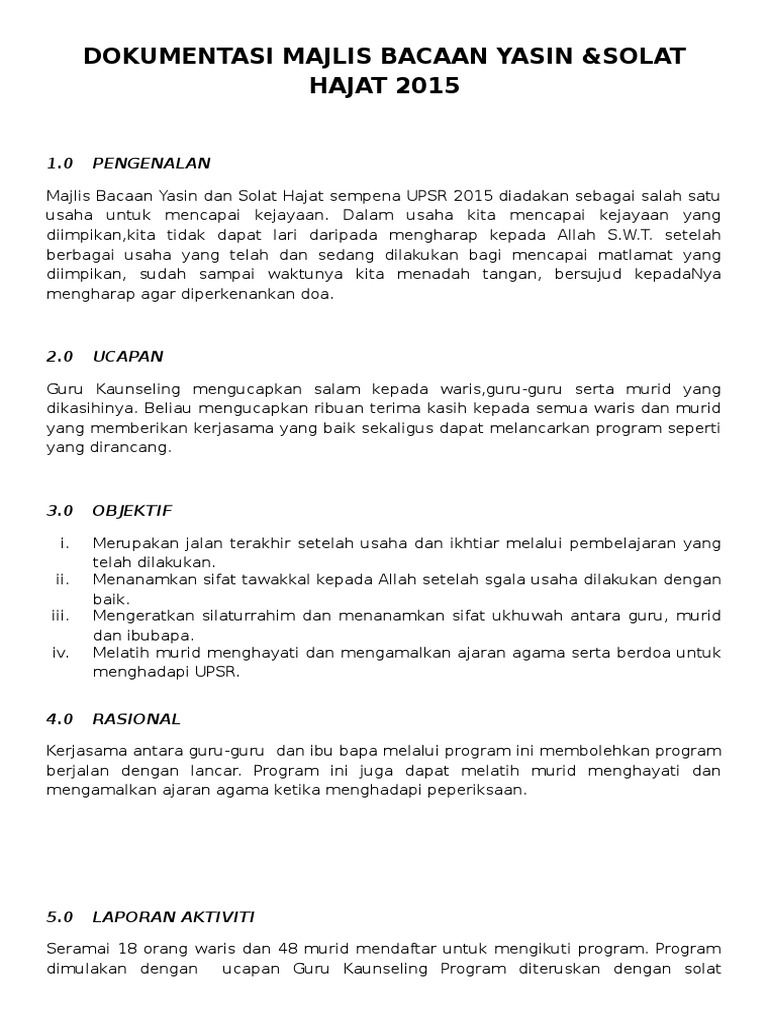 Laporan Program Bacaan Yasin Dan Tahlil Ringkas Doc from demo.dokumen.tips Semoga allah berkati dan memberi kejayaan dunia dan akhirat serta dipermudahkan segala urusan terutama dalam upsr 2018. Solat hajat merupakan solat sunat yang sering dilakukan oleh seseorang hamba allah yang menginginkan sesuatu tujuannya tercapai. Solat hajat adalah sembahyang sunat dalam amalan agama islam. Solat hajat diimamkan imam masjid negeri, datuk badli shah di masjid negeri sultan ahmad shah 1 di sini malam ini. Antara cara terbaik mendapatkan pertolongan allah adalah melalui solat hajat. Majlis bacaan yassin dan solat hajat untuk upsr adalah salah satu program yang. Menghadapi peperiksaan upsr dengan lebih tenang dan yakin. Sk orang kaya muda pakeri paloh.