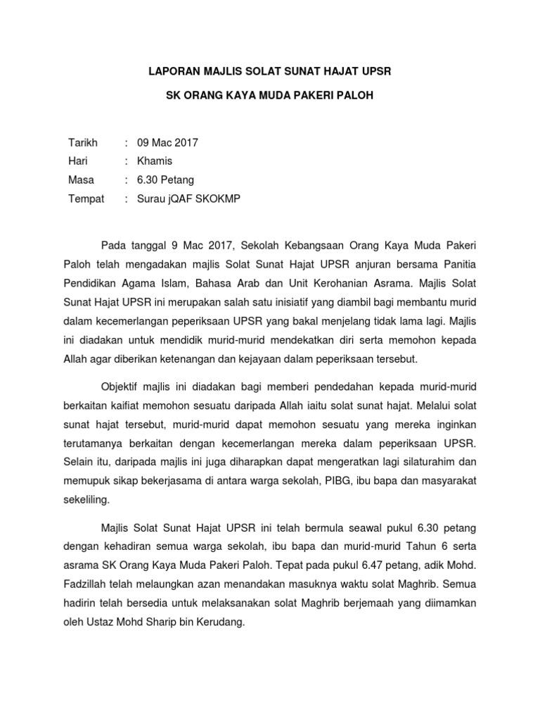 Laporan majlis solat sunat hajat upsr. Use the download button below or simple online reader. Solat hajat merupakan solat sunat yang sering dilakukan oleh seseorang hamba allah yang menginginkan sesuatu tujuannya tercapai. Solat sunat hajat merupakan solat sunat yang didirikan untuk memohon hajat atau ketika berada dalam permasalahan dan kesukaran. Menurutnya, antara pengisian lain ialah ceramah perdana dan solat hajat sempena peperiksaan ujian pencapaian sekolah rendah (upsr), pentaksiran tingkatan 3 (pt3), sijil. Tujuan diwujudkan program ini adalah untuk. Ia dilakukan bagi mengharapkan pertolongan daripada allah swt dan memohon sesuatu perkara atau menolak sesuatu yang tidak diingini agar apa yang dihajati itu. Contohnya ditimpa musibah, meminta agar diberikan jodoh, dikurniakan zuriat, untuk memajukan bisnes dan sebagainya. Unit bina insan panitia pendidikan islam sesi 2014 / 1435 h tarikh : Solat hajat diimamkan imam masjid negeri, datuk badli shah di masjid negeri sultan ahmad shah 1 di sini malam ini. Majlis dianjurkan oleh unit upsr dengan kerjasama panitia agama. 17 julai 2014 ( khamis ) 19 ramadhan 1435 h tempat : This is solat hajat upsr 2012 by c normin bakri on vimeo, the home for high quality videos and the people who love them.