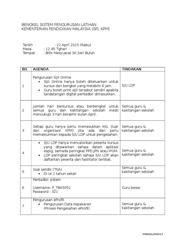 Sistem Pengurusan Latihan Kementerian Pendidikan Malaysia Ppt Download from slideplayer.info Sistem pengurusan latihan kementerian pendidikan malaysia atau splkpm merupakan sistem yang telah dibangunkan untuk memudahkan proses pengurusan latihan, bengkel, kursus dan seminar yang boleh disertai oleh para guru di bawah kementeria pendidikan malaysia. Penyata tuntutan mengenai bayaran balik letak kereta. Menyedia perancangan / jadual pengajaran bagi setiap kumpulan pelajar mengikut sesilatihan. Semoga dengan menggunakan sistem ini ia dapat meningkatkan prestasi pendidikan guru dan mencapai pencapaian sasaran. 2008 dengan efektif selaras dengan dasar kualiti upm serta objektif dan sasaran sistem pengurusan kualiti upm; Home › berita semasa › 'roadshow' latihan juruteknik & pengurusan refrigeran r32. Perolehan bekalan & kompetensi & latihan perkhidmatan. Latihan formal adalah kurang dirancang.