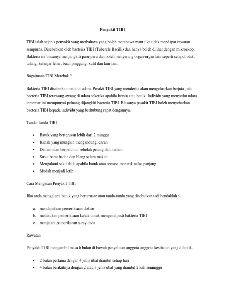Related : Tanda Tanda Penyakit Tibi - Penyakit Tibi Boleh Membawa Maut Kenal Pasti Tanda Tandanya - Terdapat beberapa tanda penyakit tibi yang boleh dikesan awal namun pengesahan hanya boleh dilakukan melalui ujian di klinik atau hospital..